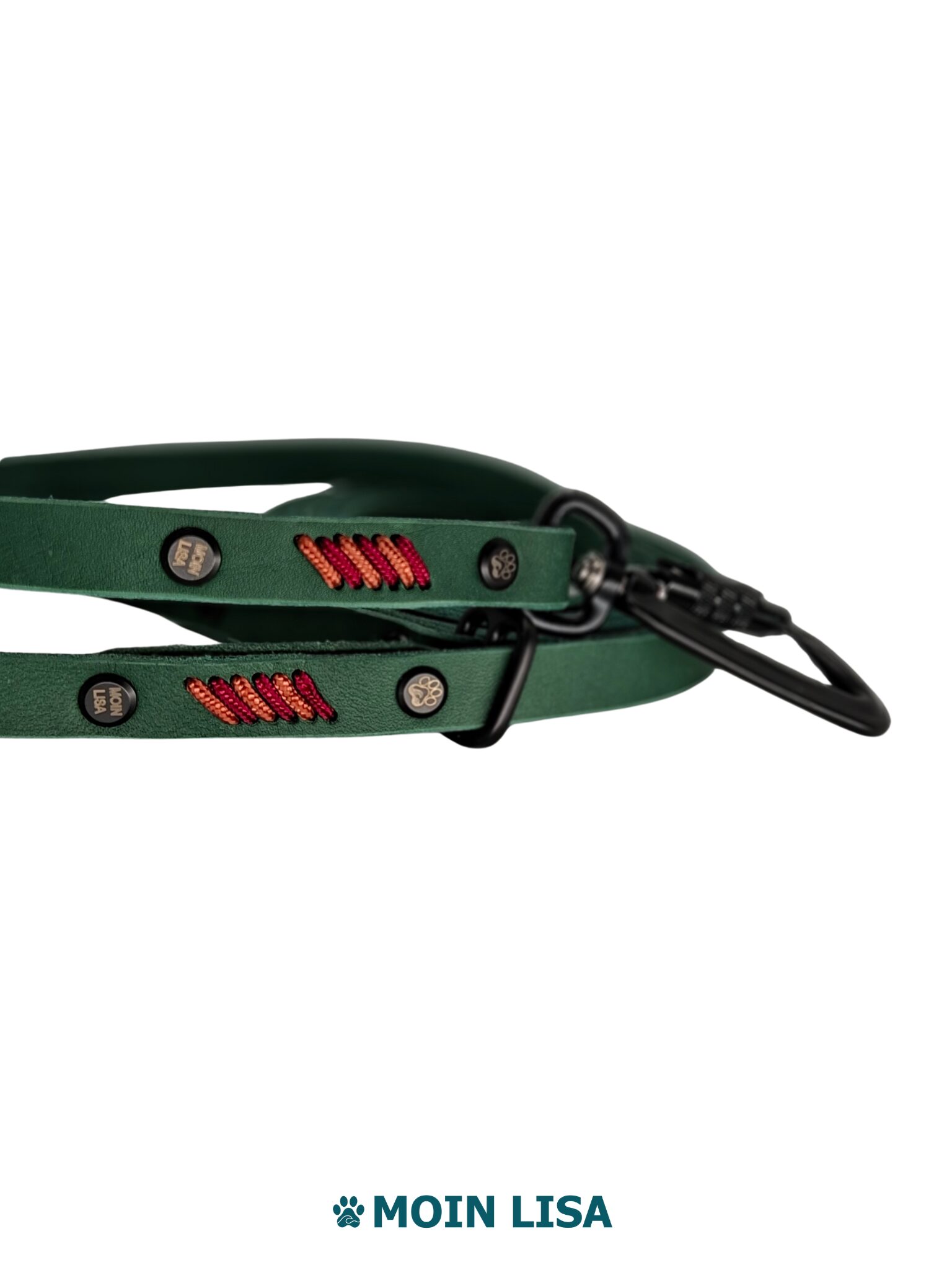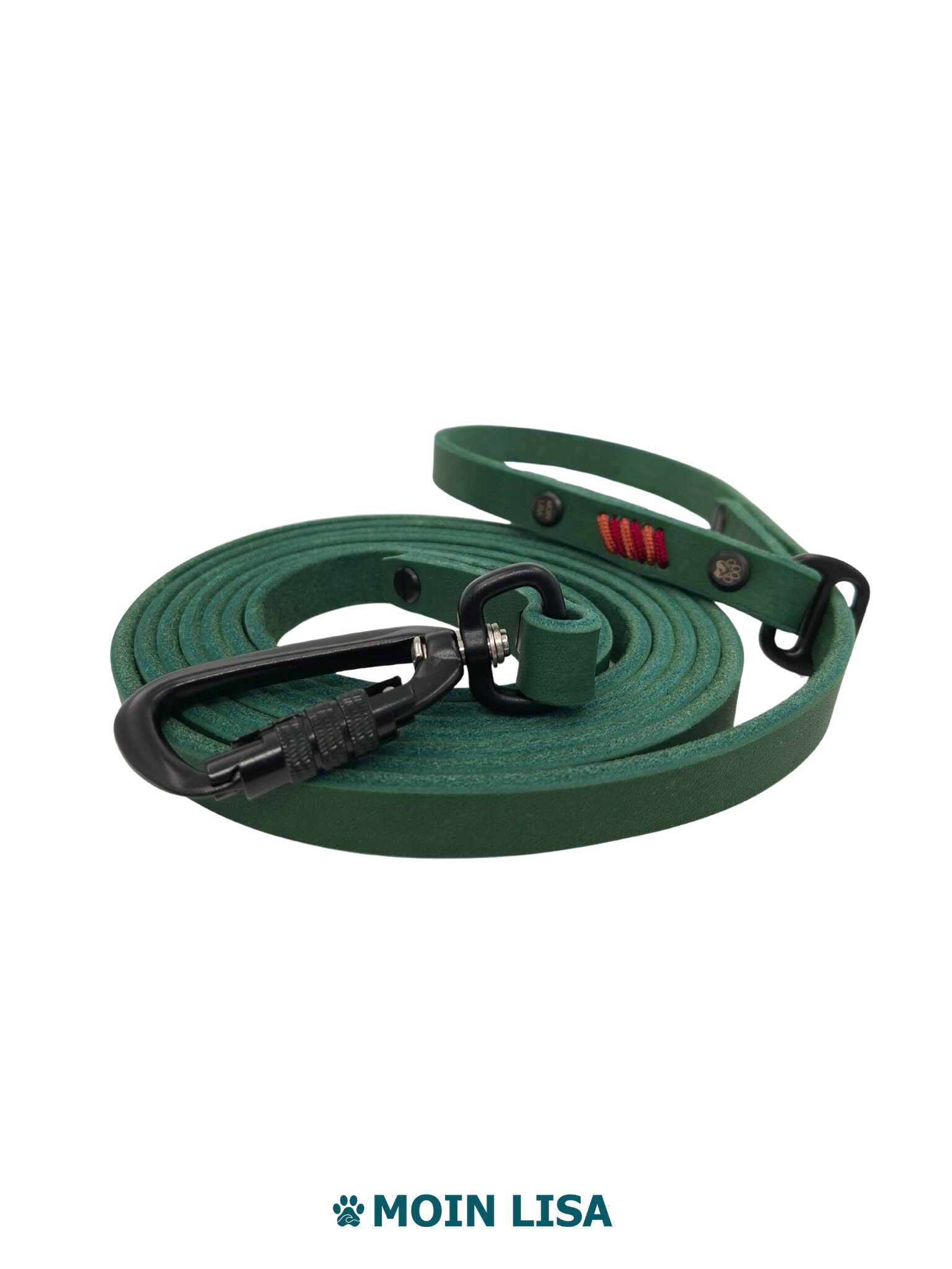 Diese einteilige Umhängeleine aus hochwertigem Fettleder in der Farbe Grün Neu, richtet sich an Menschen, die Funktion, Material und Design bewusst wählen.