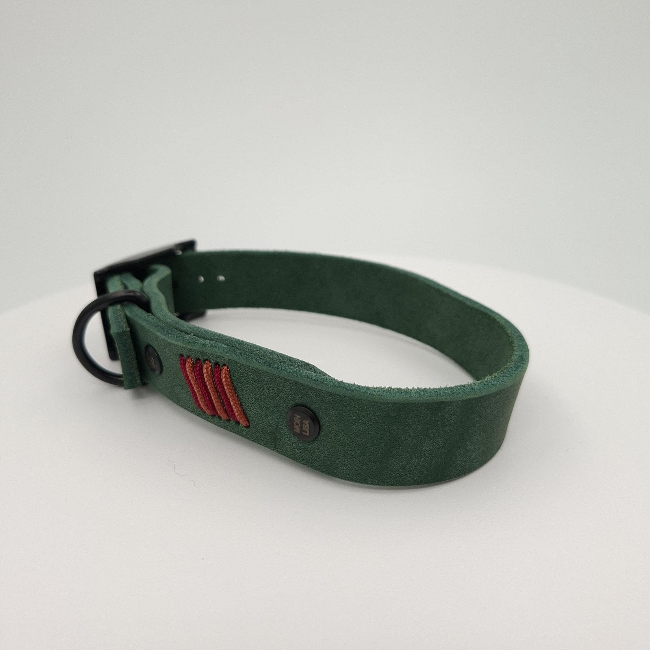 Die Doppelstegschnalle (Gurtschnalle) sorgt für einen sicheren Sitz und eine präzise Größenanpassung. Für zusätzliche Stabilität ist das Halsband mit Buchschrauben verarbeitet.