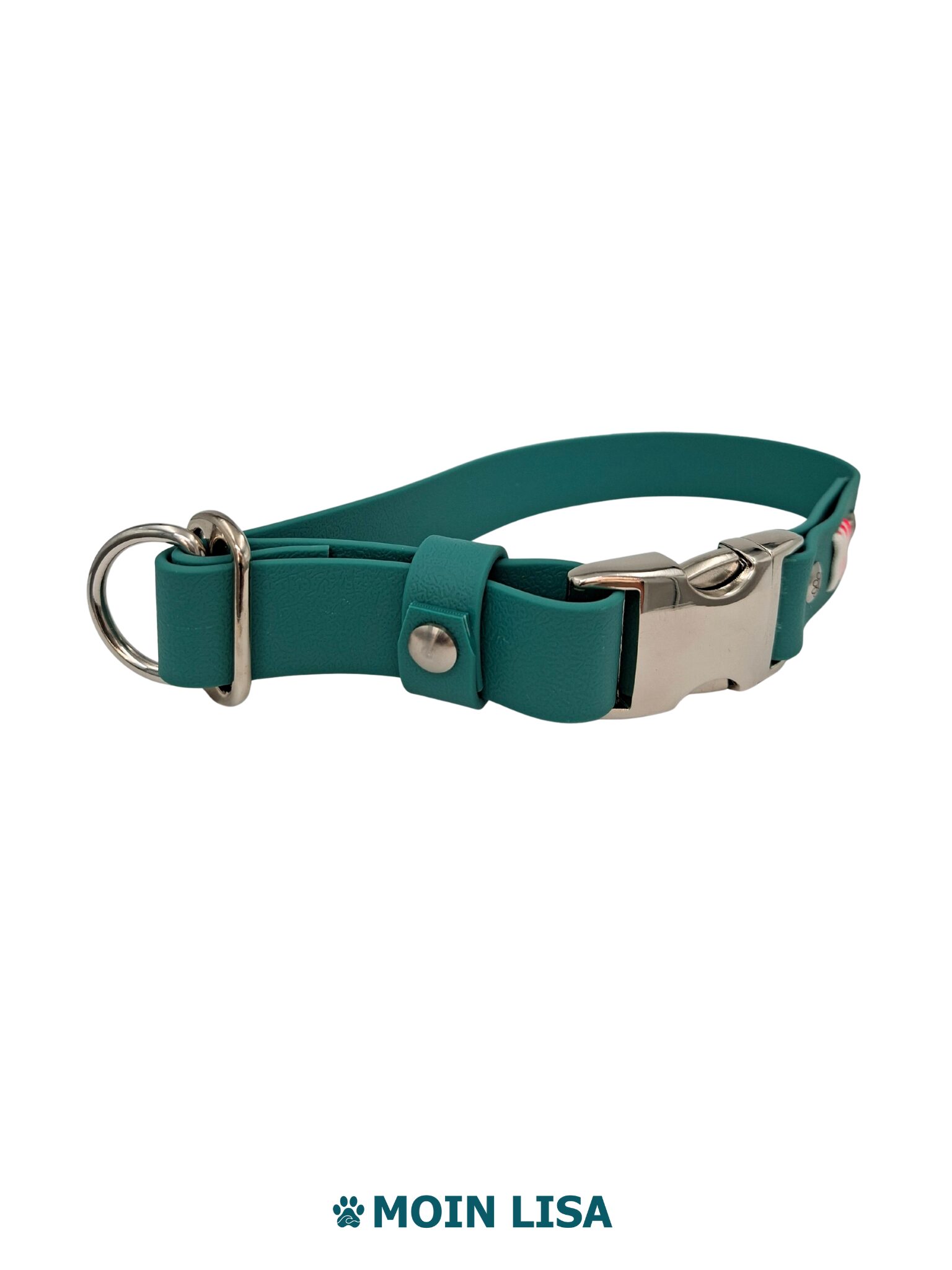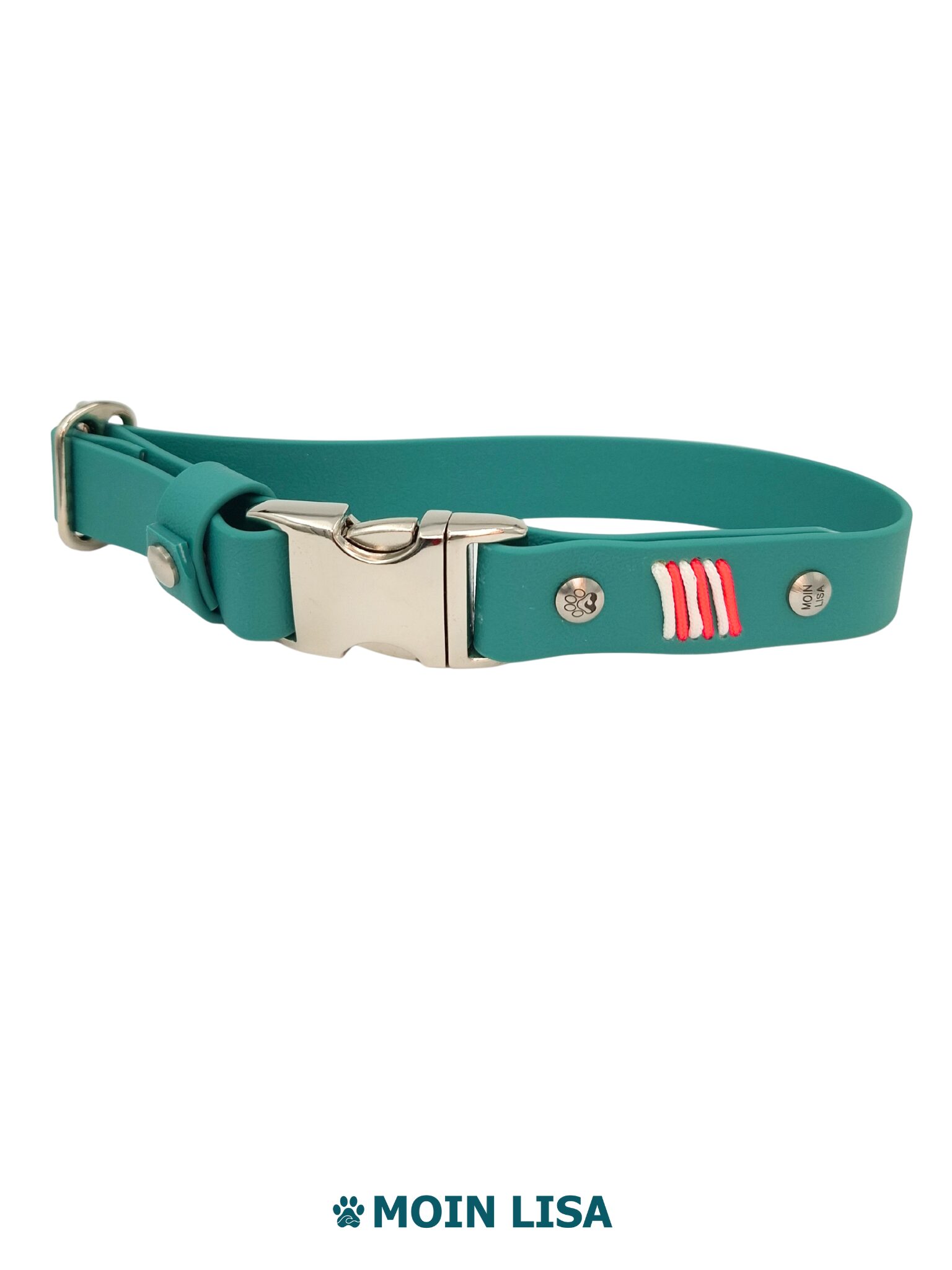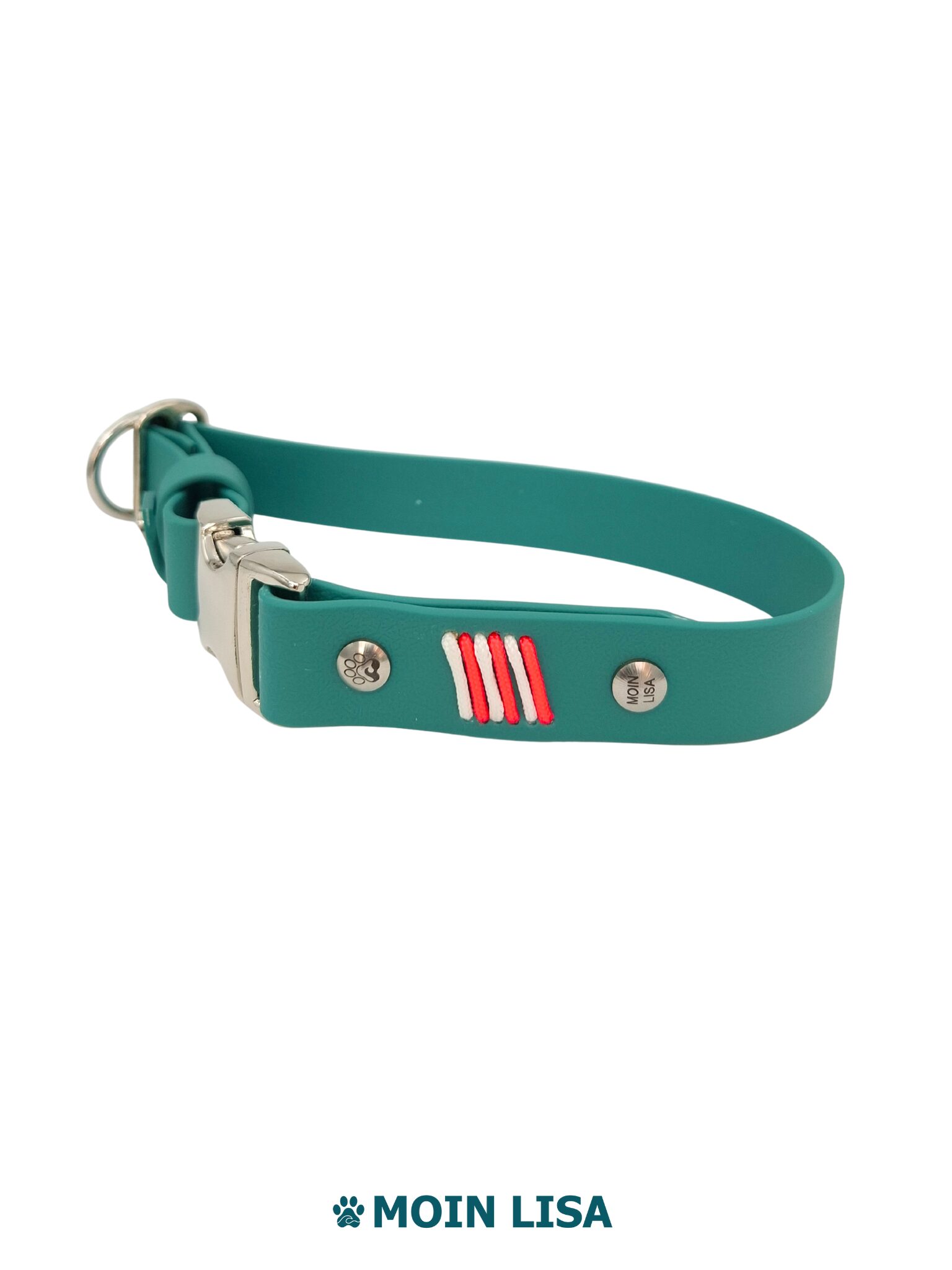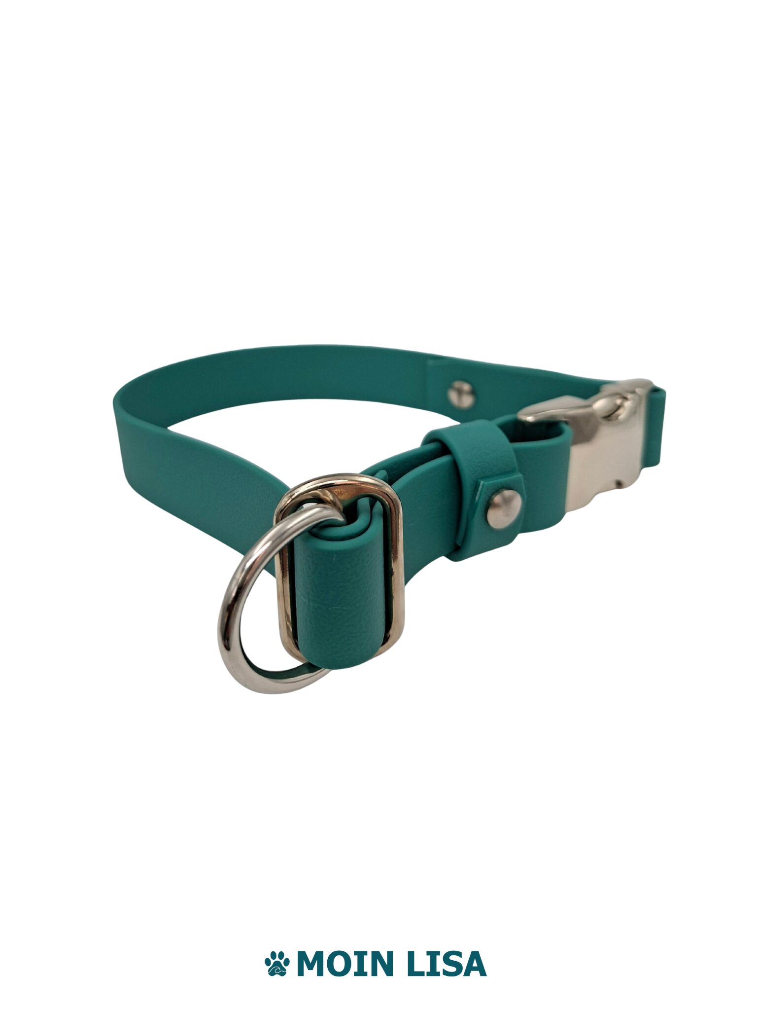Gefertigt aus 25 mm breitem, beschichtetem Gurtband, ist das Halsband wasser- und schmutzabweisend, robust und alltagstauglich.