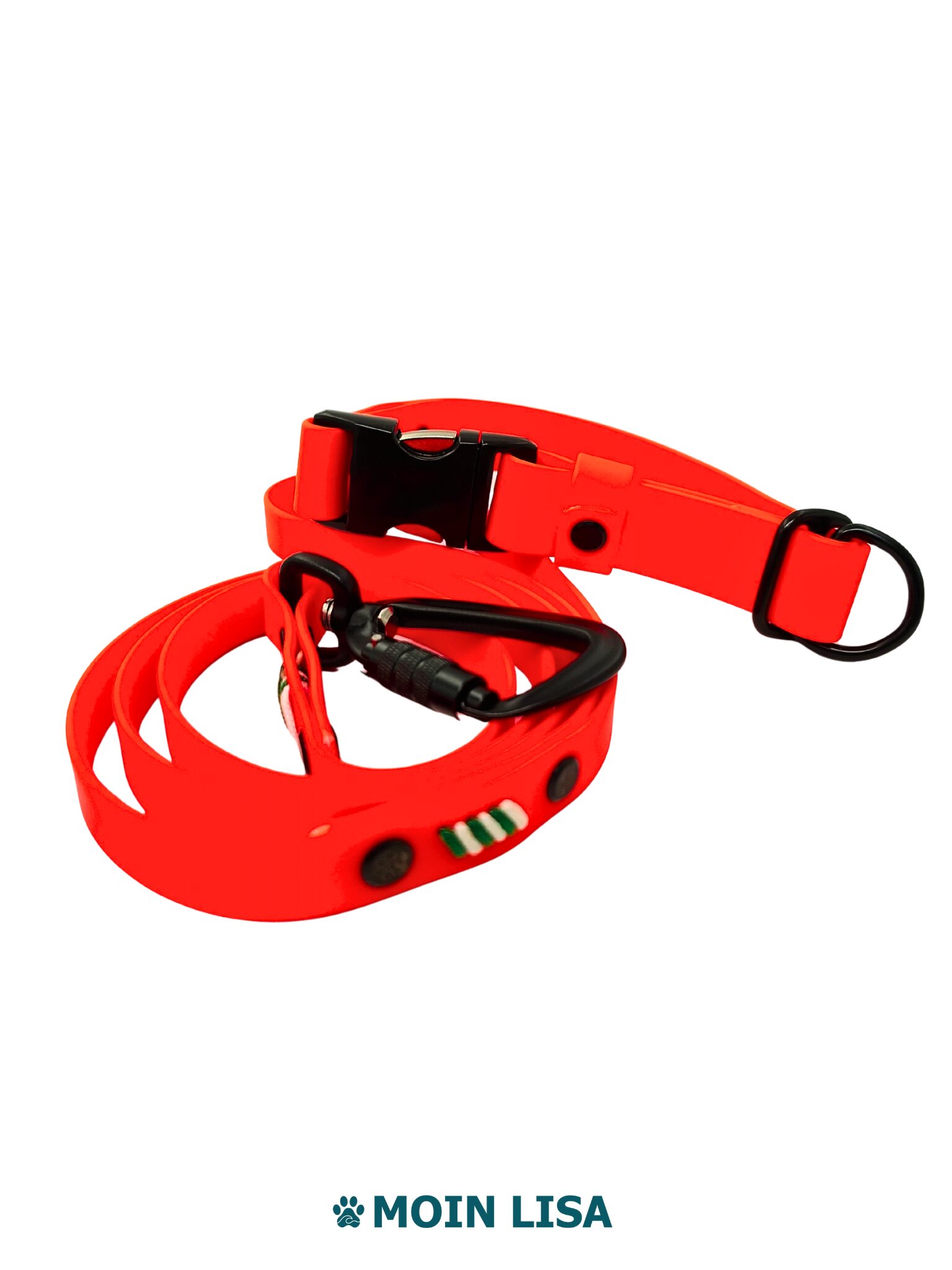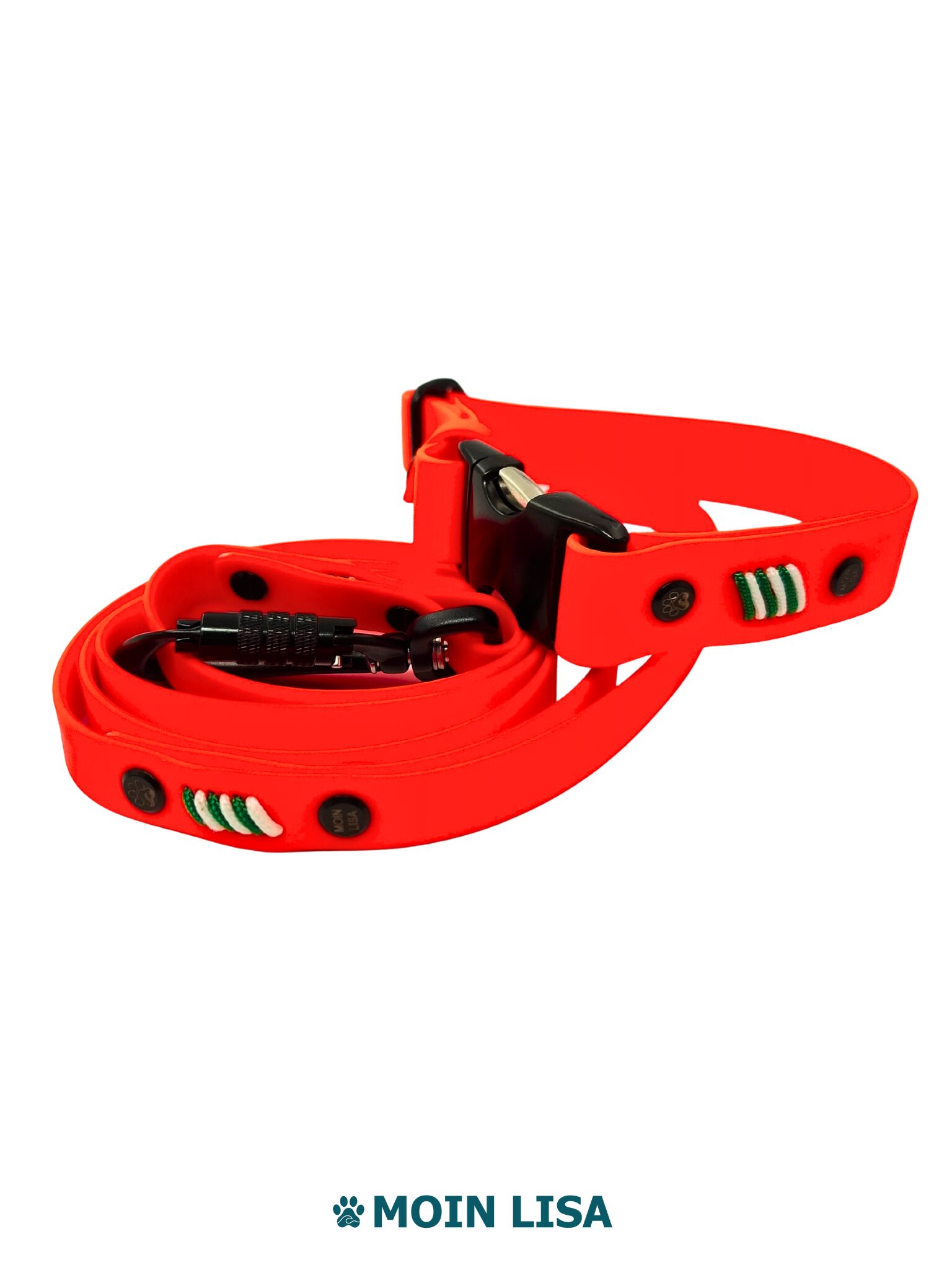 Dieses Set richtet sich an Menschen, die Funktion, Material und Design klar priorisieren. Halsband und Leine bestehen aus beschichtetem Gurtband in Neonorange, passen optisch zusammen und halten dem Alltag zuverlässig stand. Das Material weist Wasser und Schmutz ab und bleibt auch bei Nässe griffig.