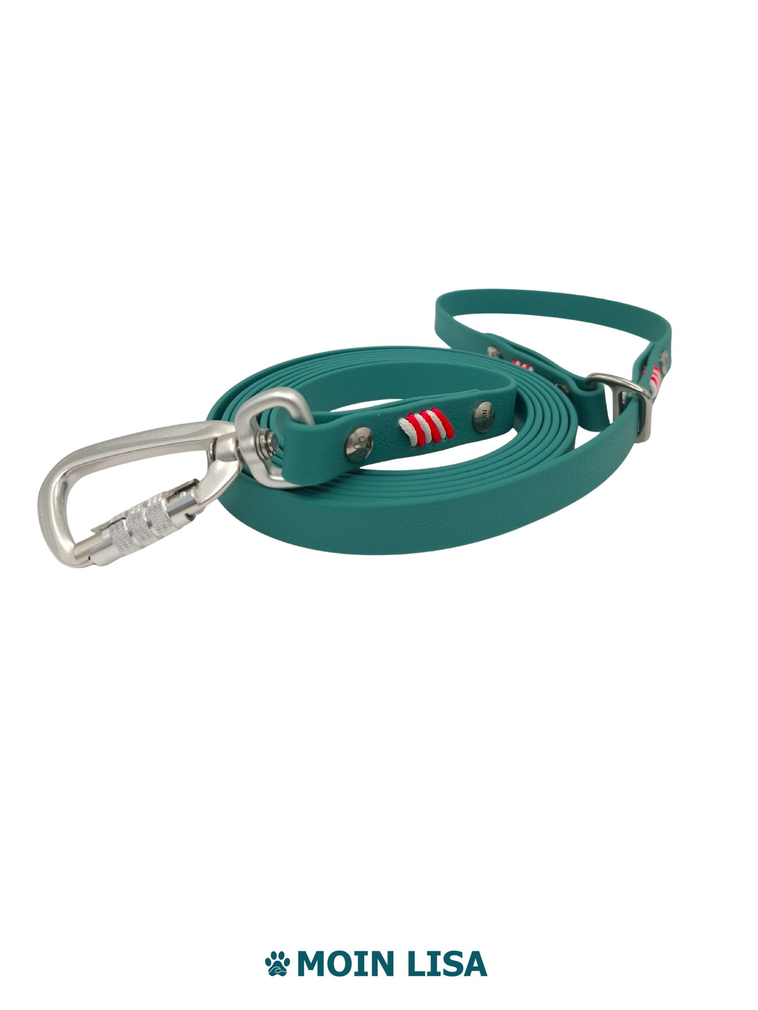 Die Leine ist 15 mm breit, 2,5 m lang und stufenlos verstellbar. Du nutzt sie als Crossbody-Leine oder lange Führleine. Der Aluminium-Sicherheitskarabiner und der silberfarbene Beschlag sorgen für sichere Verbindung und ein klares, reduziertes Erscheinungsbild. Die Flechtung greift das Design des Halsbands auf.