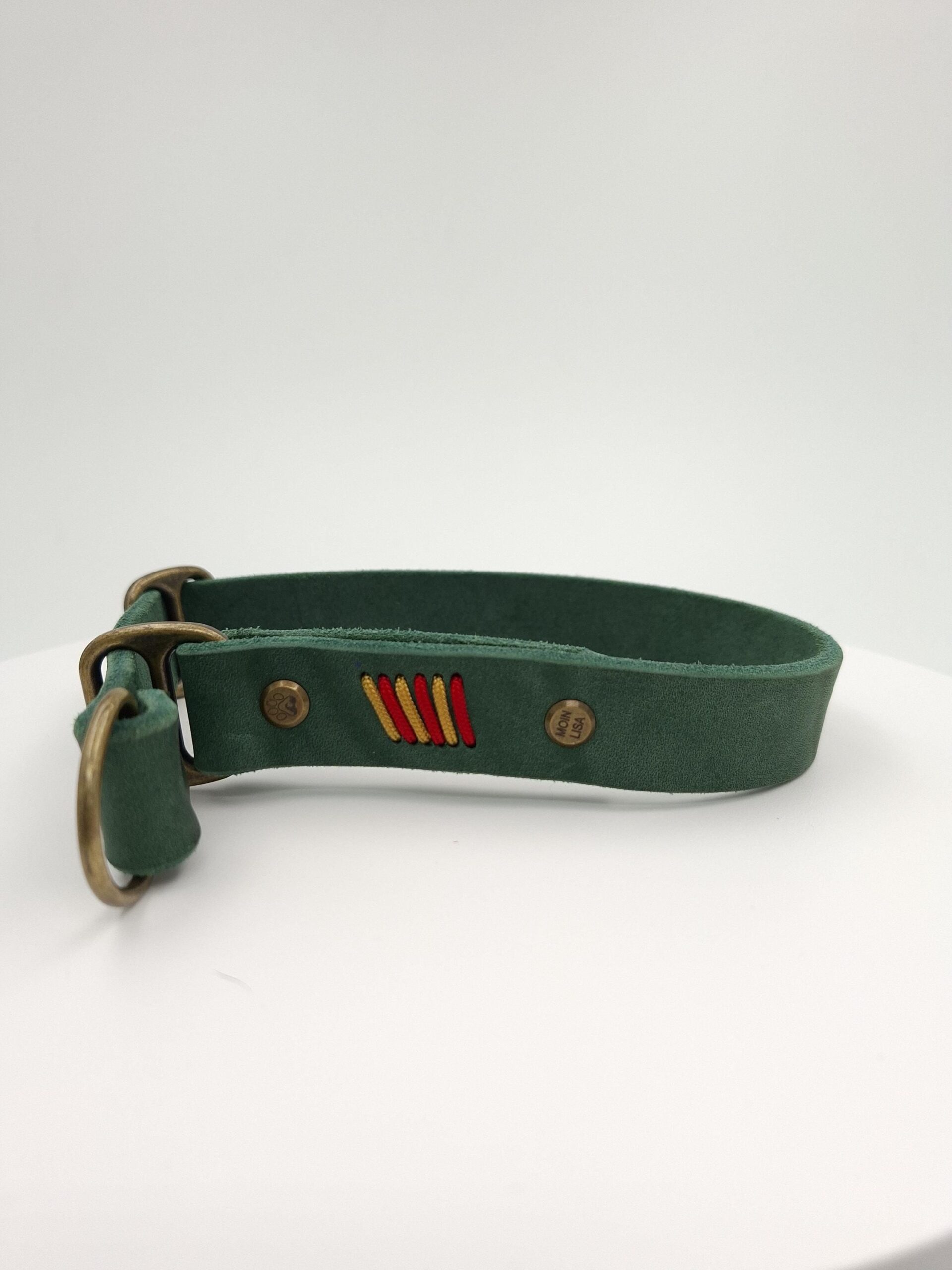 Die Antik-Messing-Beschläge und die liebevoll handgeflochtene Paracord-Flechtung in Gold Rush und Imperial Rot verleihen dem Halsband seinen festlichen Charakter. Ein winterlicher Hingucker, handgefertigt an der Nordsee – jedes Stück ein Unikat.